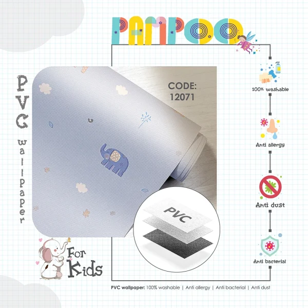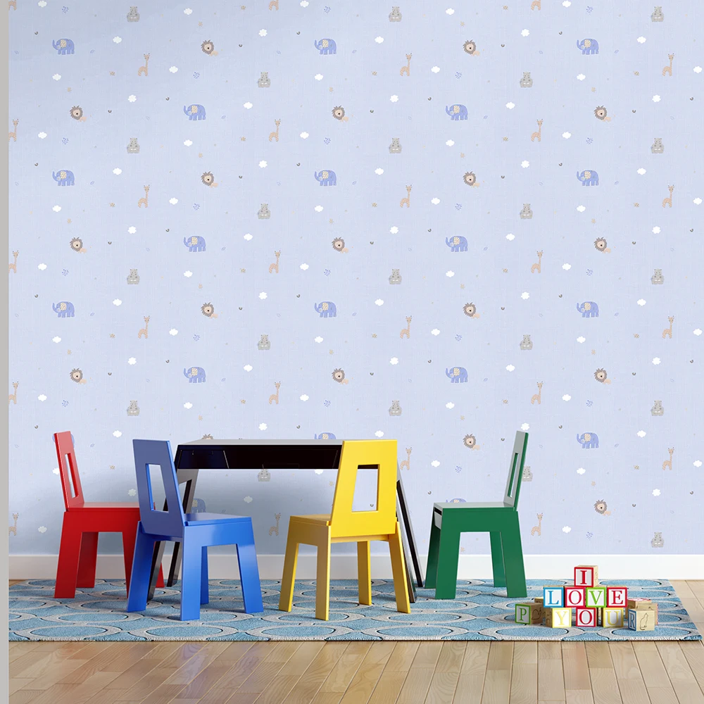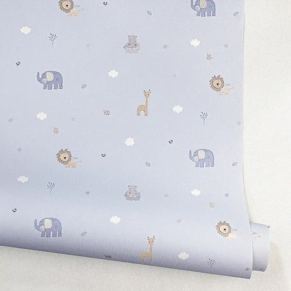 کاغذ دیواری کودک کد 12071، دیوارپوشی آرامشبخش است که روی زمینهی آبی مهآلود با بافتی ظریف اجرا شده است. روی این زمینه پاستلی، حیوانات دوستداشتنی همچون فیلهای آبی با وصلههای خال خالی کرم، شیرهای کاراملی کوچک با نوشتهی «lion» ریز کنارشان، زرافههای نخودیِ نقطهدار و اسبهای آبیِ طوسی قرار گرفتهاند؛ همچنین ابرهای سفید پفکی، برگهای آبی، دانهها و بوتههای ریز، فضا را پر از ریتم و کشفهای کودکانه میکنند. چیدمان پراکندهی این حیوانات باعث میشود اتاق شلوغ به نظر نرسد و برای دیوار شاخص یا پوشش هر چهار دیوار، در اتاق نوزاد تا خردسالان 7 سال عالی باشد.